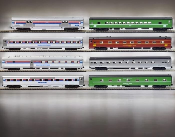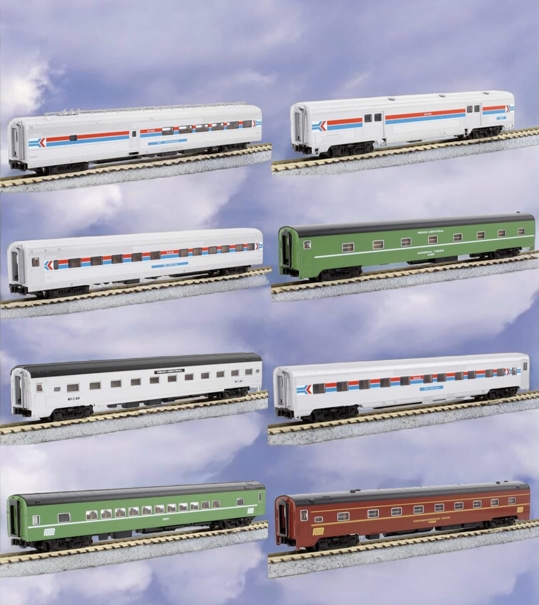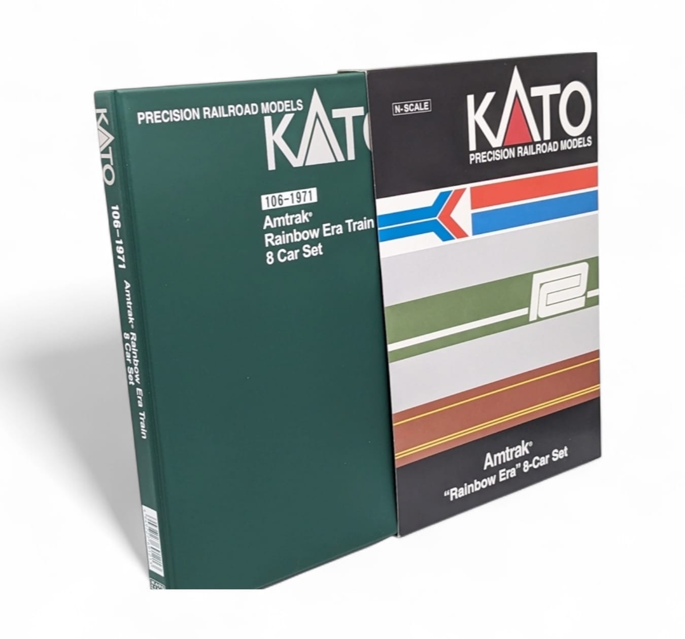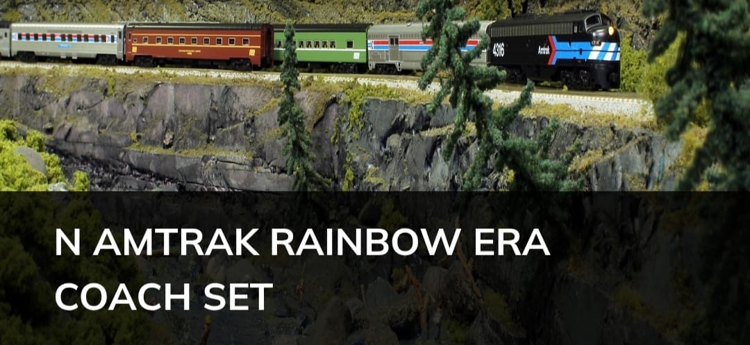 Kato Amtrak Rainbow Era Coach set 美鐵彩虹套裝客車廂 (N比例 1:160) 「Amtrak Rainbow」指的是美國鐵路旅行中被稱為「彩虹時代」(1971年-20世紀70年代初)的特定歷史時期,在此期間 ,新成立的Amtrak運營著一支色彩斑斕、風格各異的客車車隊,這些客車是從其前身鐵路公司繼承而來的。 一套八節基礎全偏成,可配合E8等經典美式車頭運行